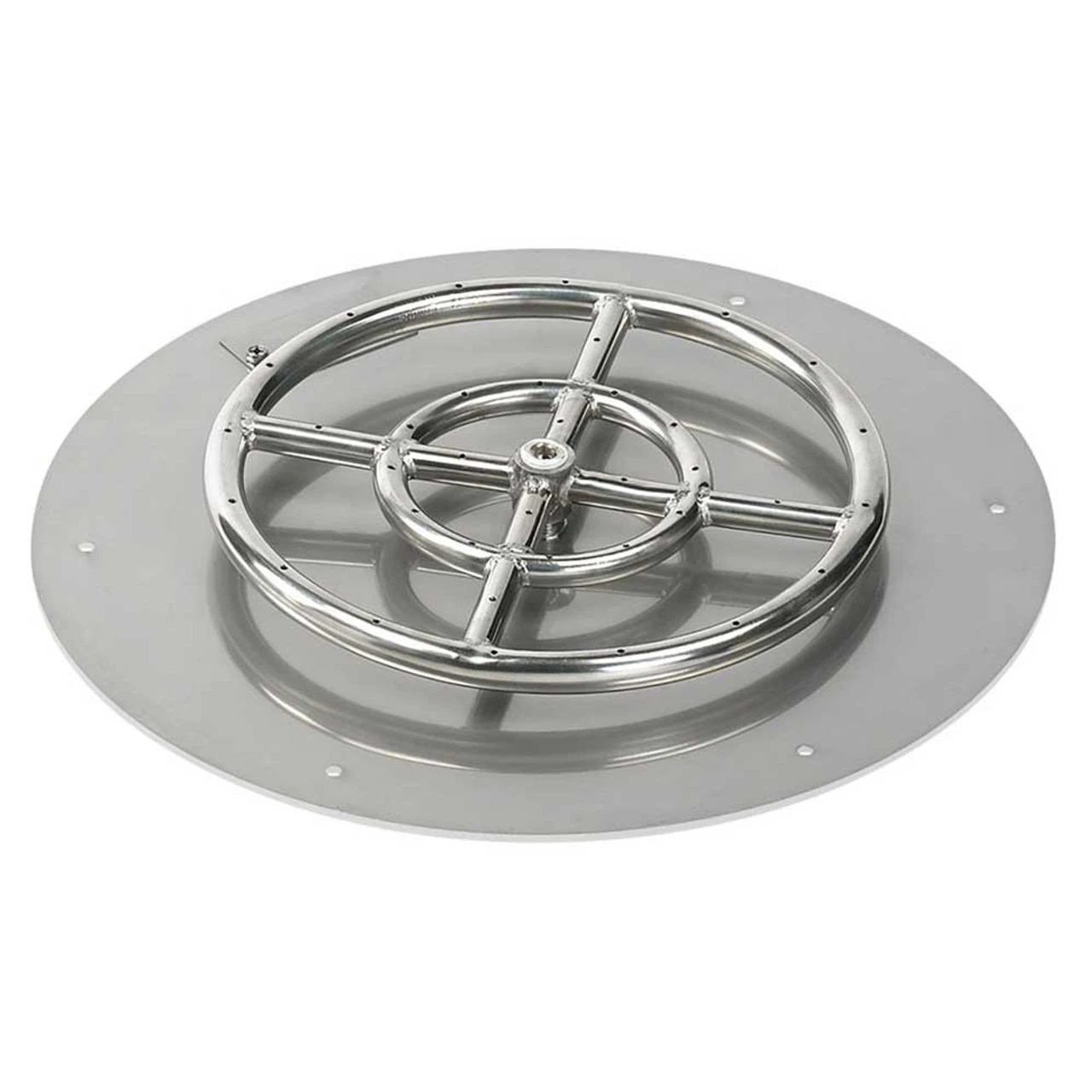 12″ Ring Burner – This 12″ fire pit ring burner fits on top of your fire pit burner pan. It is made of high grade 304 stainless steel which ensures its durability under extreme heat and severe weather conditions. The cross bar design provides for better flame distribution. The holes in the ring are drilled, not punched, which prevents any loud whistling noises. The ring burner works best under 2 – 4 inches of fire glass.