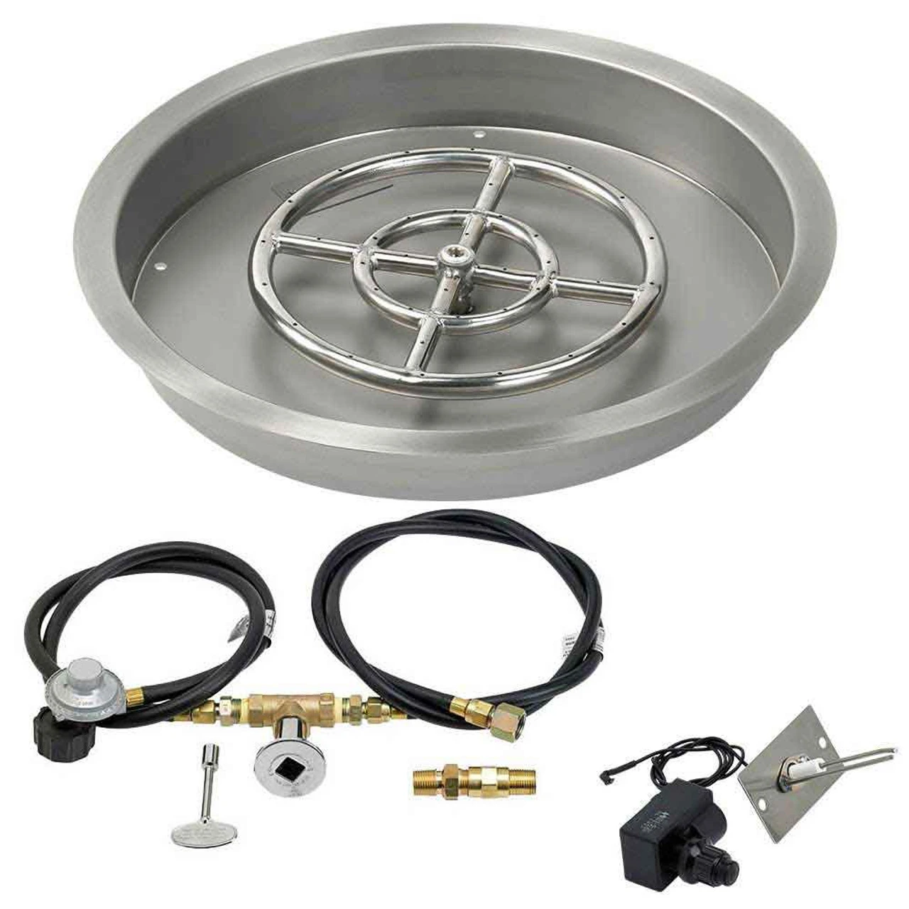 Our 19″ round drop-in pan (12″ ring) with spark ignition kit (propane) comes fully equipped with all the following components:
