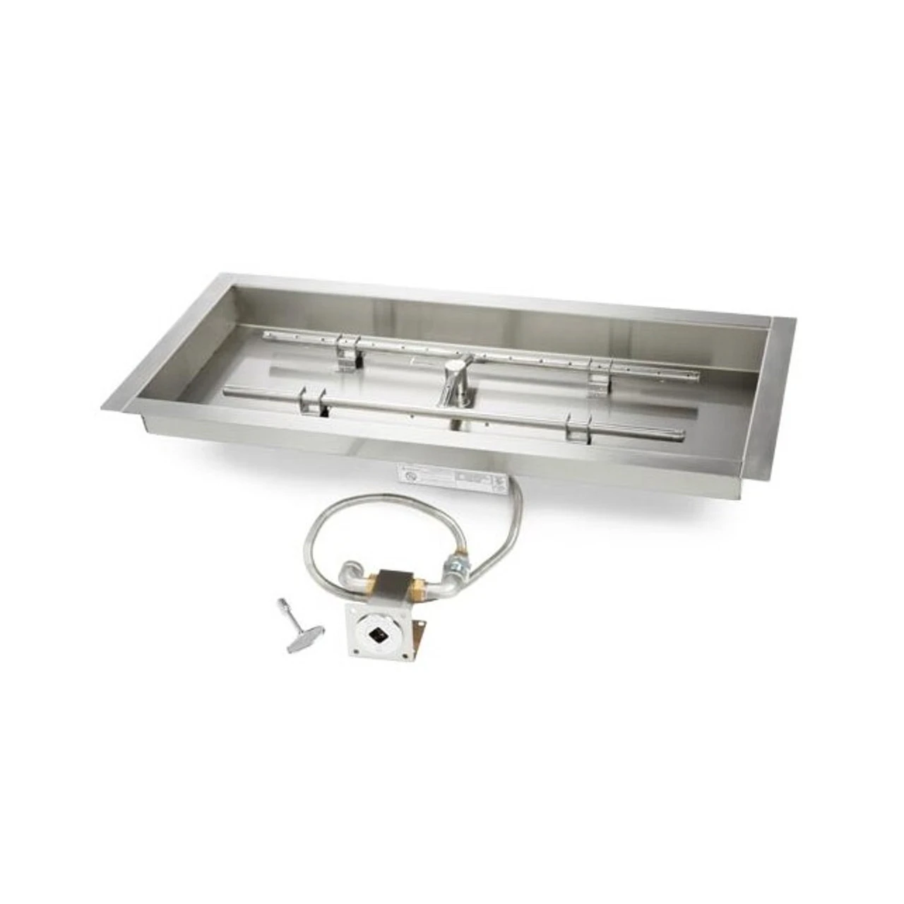 - Comes fully assembled with #304 stainless steel pan, burner, Decorative Key Valve with stainless steel mounting bracket and whistle-free flex line.