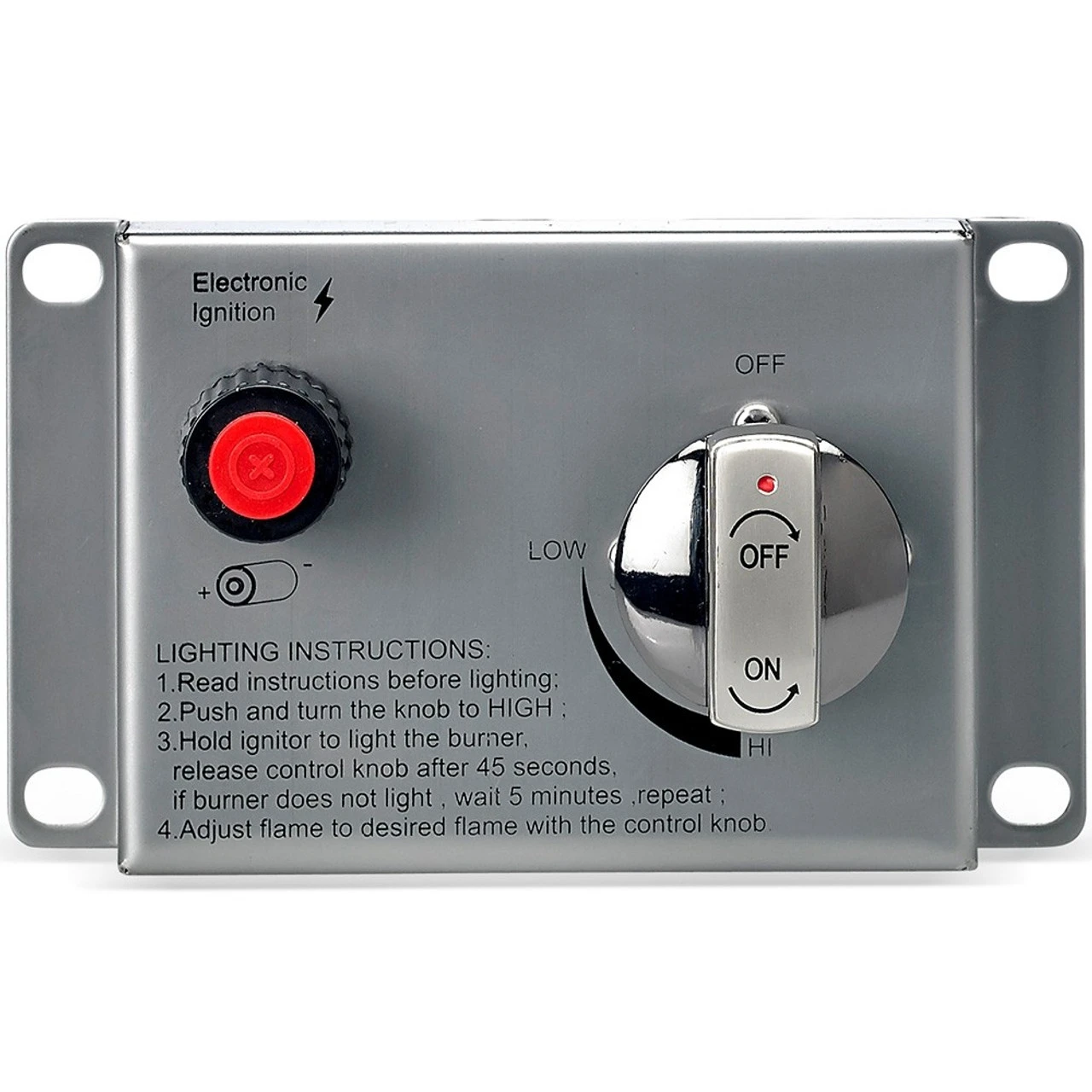 Spark Ignition Pilot Assembly: Battery powered push button ignites the flame using a rapid ignition and thermocouple.