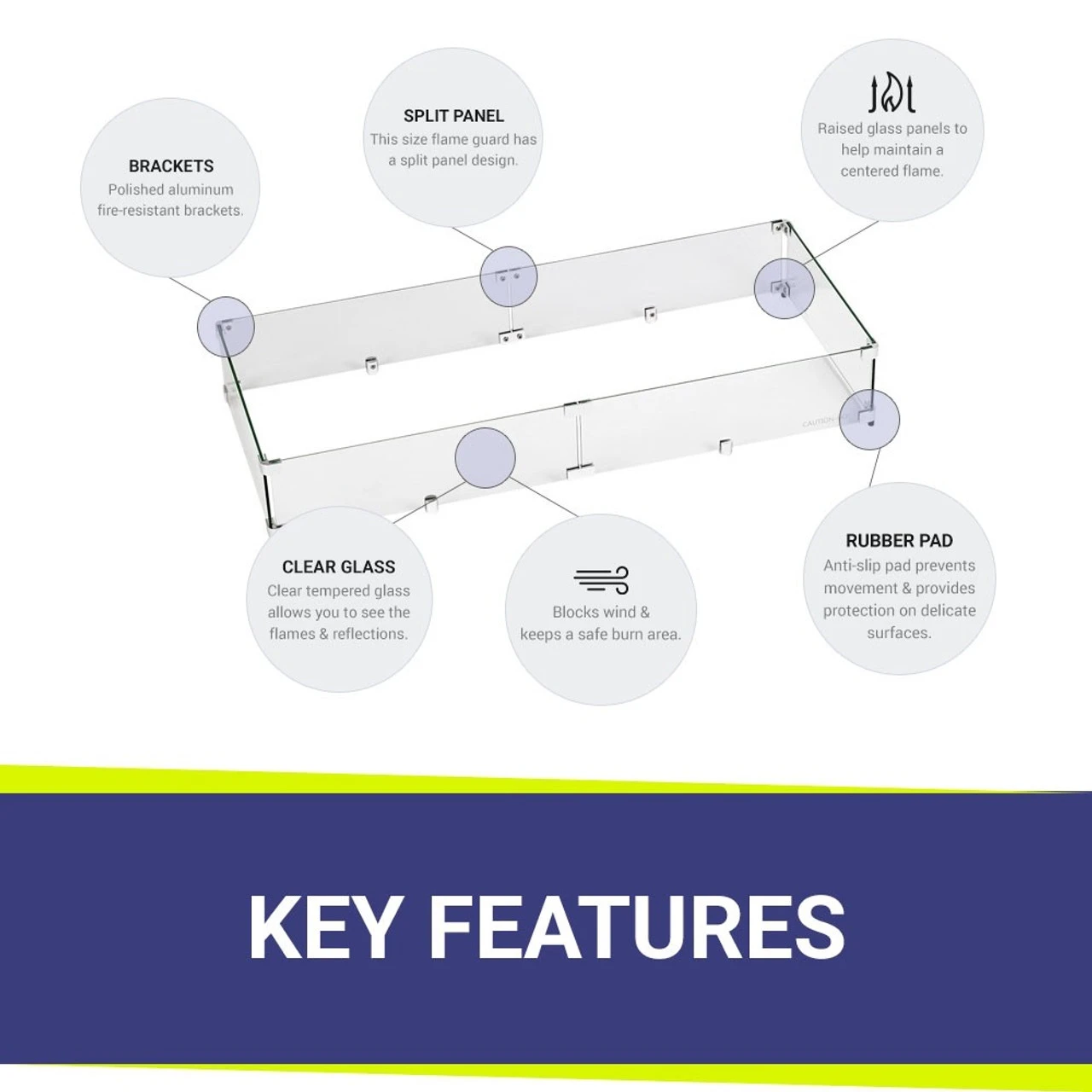 Rectangular Glass Flame Guard for 36″ x 12″ Drop-In Fire Pit Pan Specifications:
