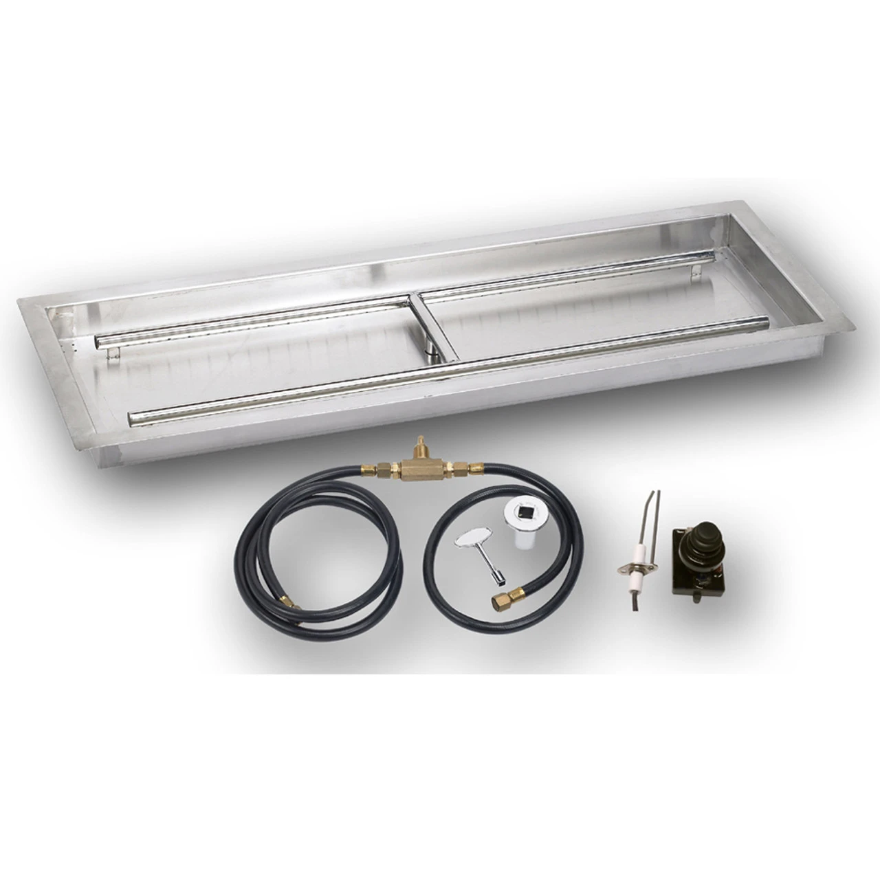 The Rectangular Stainless Steel Drop-In Fire Pit Kit for Natural Gas kit includes the American Fireglass 48″ Rectangular drop in Fire Pit Pan, a 36″ Stainless Steel H Burner, Key Valve with Chrome cover plate, Push Button Ignition Kit, And 2 – 5 foot Black gas hoses.