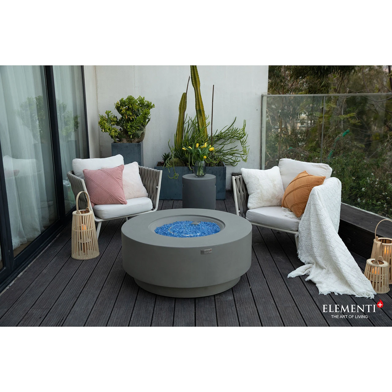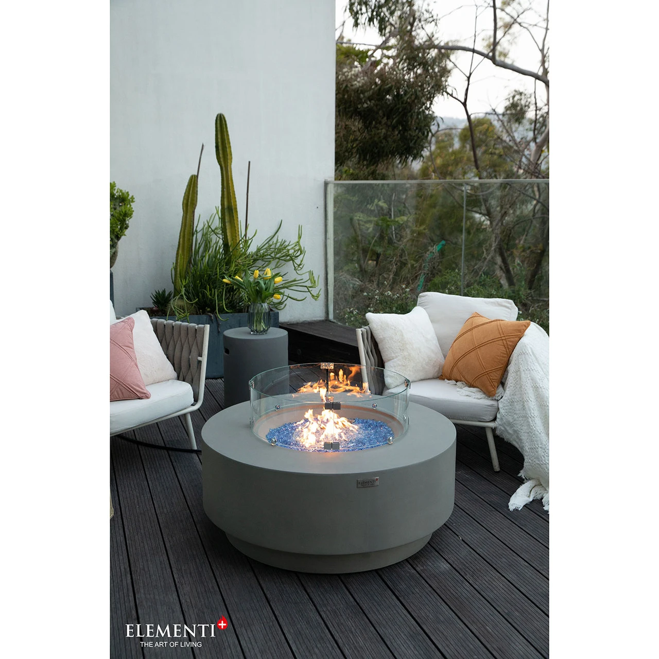 The Colosseo is the new and improved round fire table featured on the Elementi Plus line. The body is handcrafted to precision using glass-fiber reinforced concrete, which is both lightweight and durable against the elements. The burner is constructed of 16-gauge 304 stainless steel that provides a generous BTU output of 60,000; the warmth of the flames can be felt across the patio or deck. The Colosseo comes in the familiar light gray color that is featured on the Elementi and Modeno line.