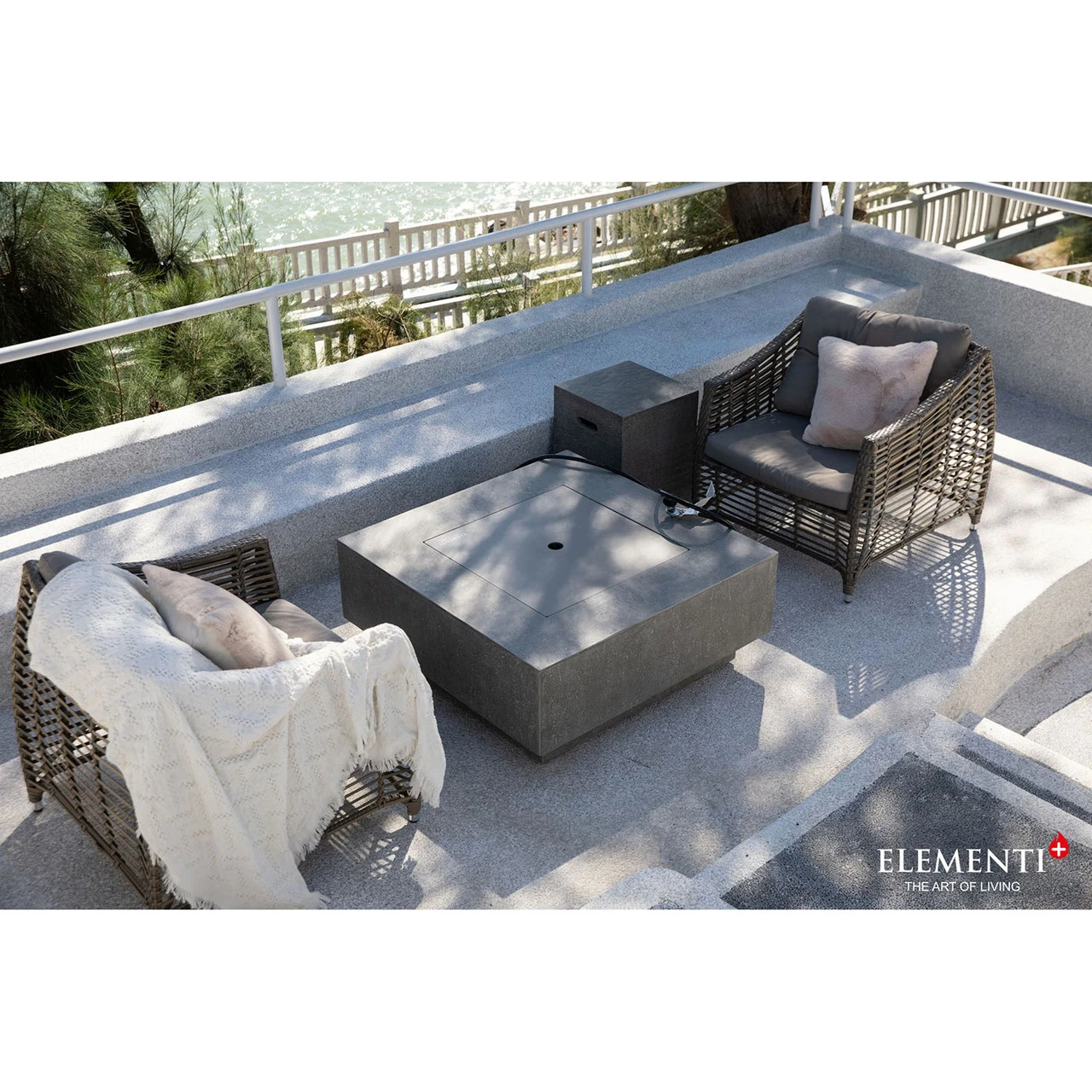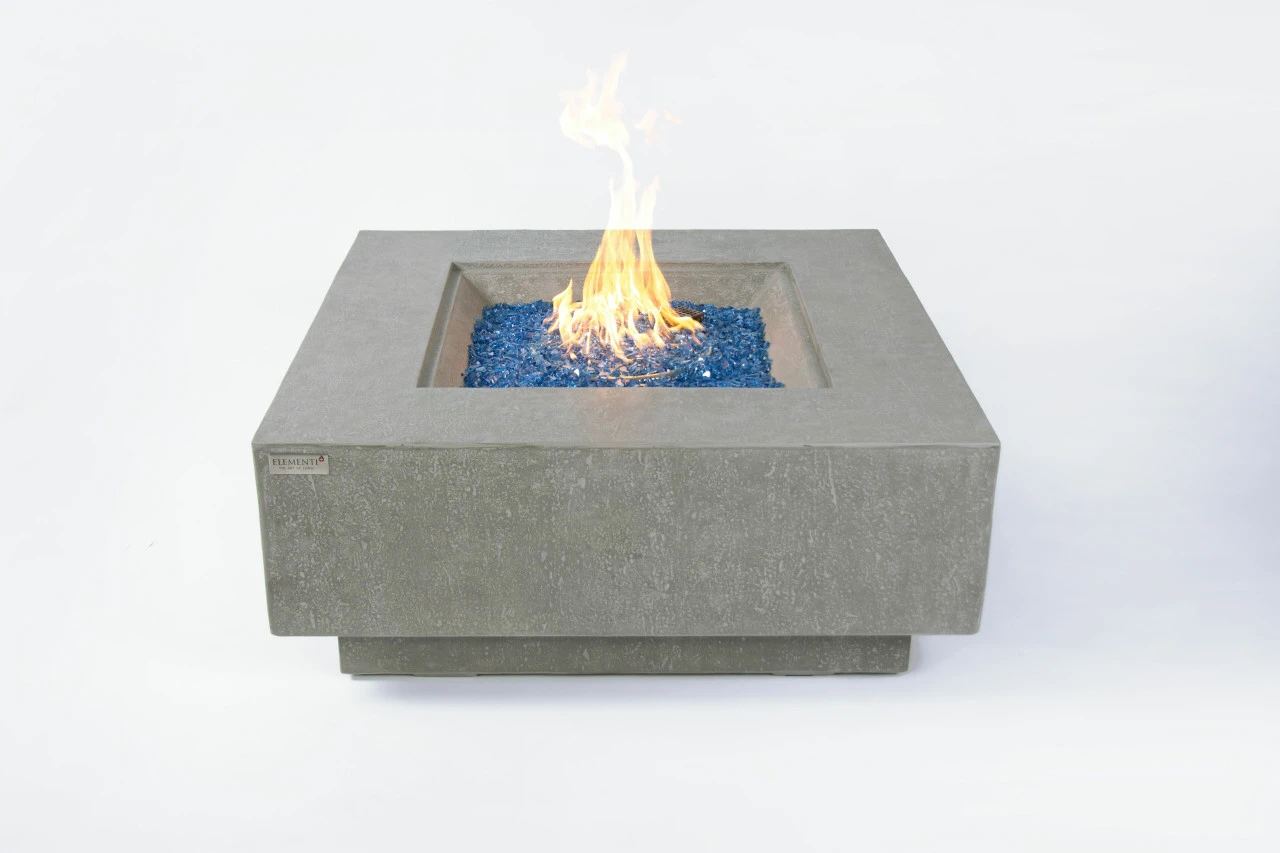 The Victoria is a new and improved square fire table from theย Elementiย Plus line. The body is handcrafted to precision usingย glass-fiber reinforcedย concrete, which is both lightweight and durable against the elements. The burner is constructed of 16-gauge 304 stainless steel that provides a generousย BTUย output of 60,000; the warmth of the flames can be felt across the patio or deck.