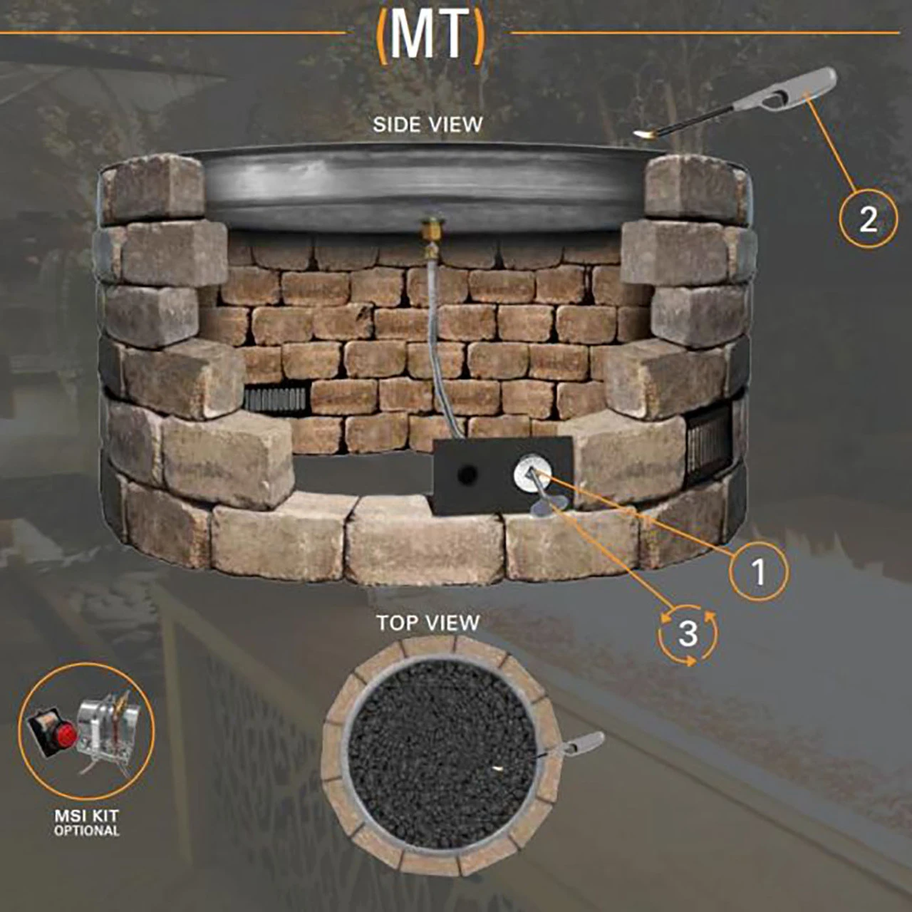 Firegear FPB-DBSMT-HC Match Light Ignition Gas Fire Pit Burner Kit with Round Flat Pan & Stainless Steel Burning Spur provides a high quality burner system to complete your gas fire pit project. Both the burner and the pan are constructed from heavy duty 304 stainless steel to create a long lasting and durable product while the unique “spur” design creates a realistic flame appearance. Firegear’s unique match throw (MT) kits are designed to provide a simple match light ignition system for reliability and ease of use. These kits are designed with higher capacity orifices to provide a larger amount of BTU but are not UL Listed.